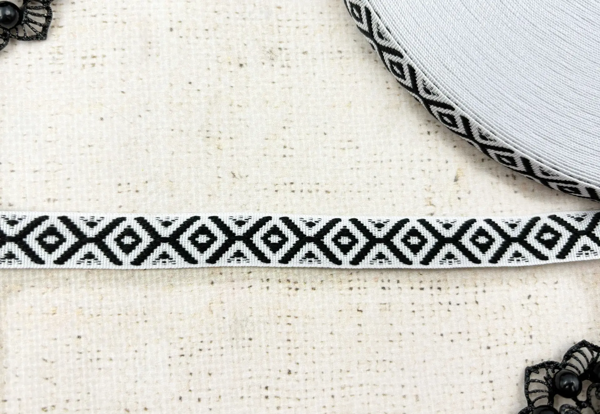Тесьма жаккард двухсторонняя, ш. 1,5 см, чёрный/белый